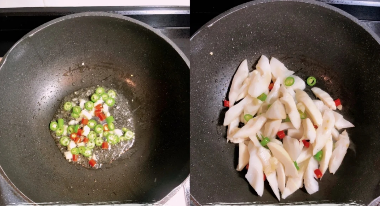 第七步:鍋底加少許油,加上蒜頭和辣椒爆香,炒出蒜香味和辣椒香味,倒入竹筍爆炒3分鐘左右。