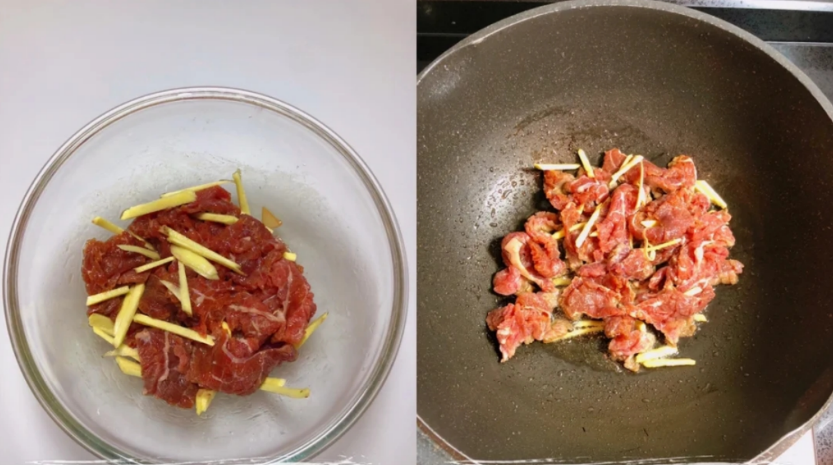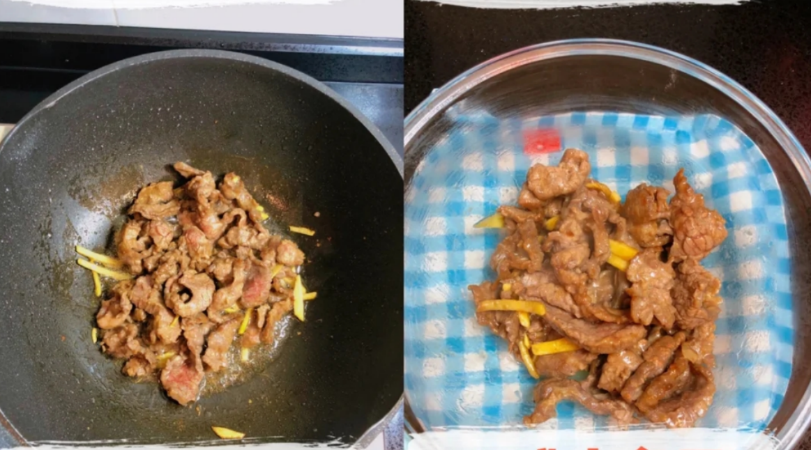 第六步:鍋底慢慢燒熱一會(huì)兒,鍋底加上食用油,倒入腌制好的牛肉片,迅速翻炒至7成熟,盛出。